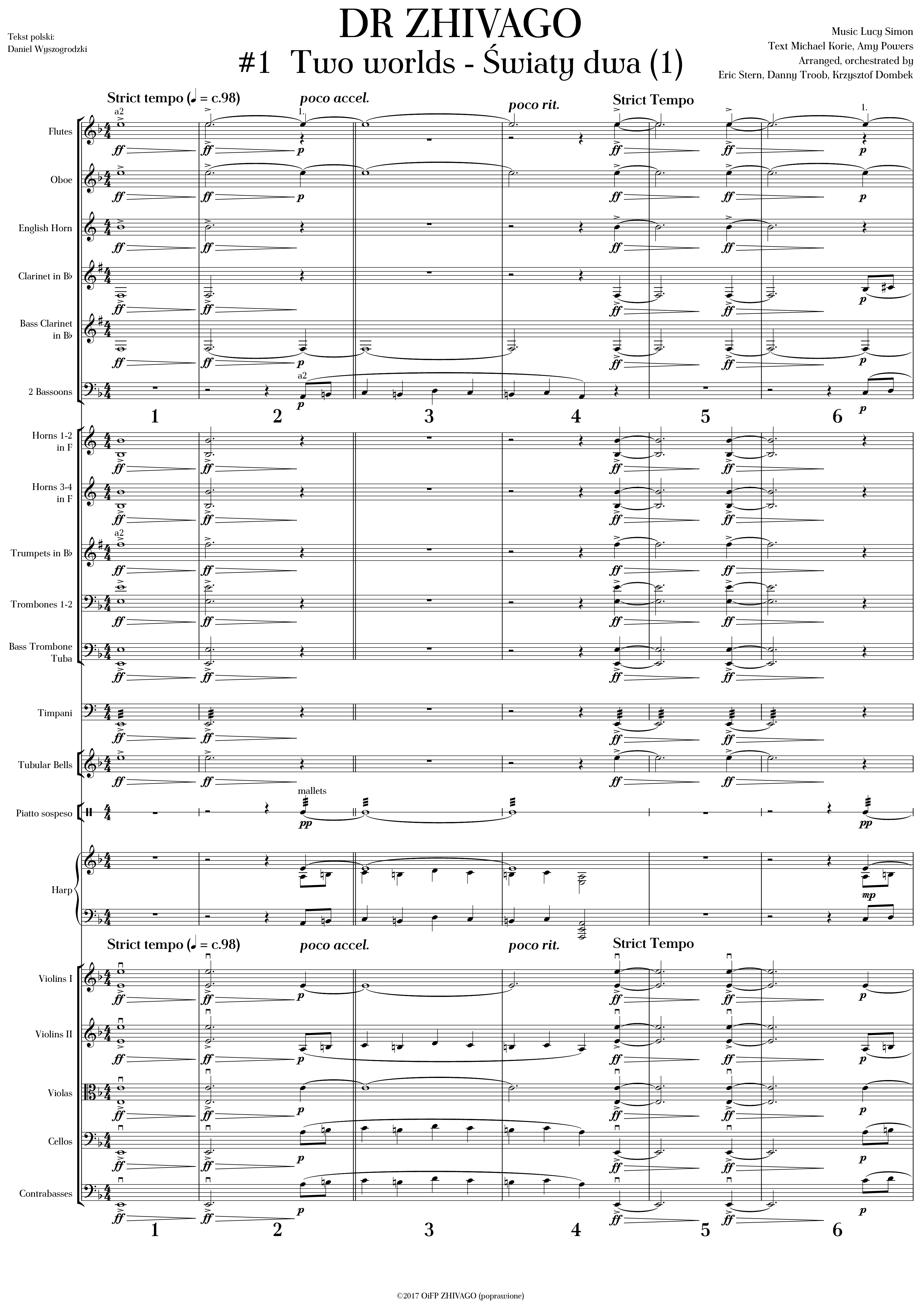 Musical Doctor Zhivago - additional orchestration and all materialsMarian Borkowski - VOXKrzysztof Baculewski Concerto per Orchestra Full score pageKrzysztof Baculewski Concerto per Orchestra violins partKrzysztof Baculewski Concerto per Orchestra percussion partTranscription of F. Chopin Piano ConcertiMarcin Blazewicz Symphony full score pageMarian Borkowski Sanctus choral scorePawel Lukaszewski Three songs for voice and pianoPawel Lukaszewski Arrampicata full score example 1Pawel Lukaszewski Arrampicata full score example 2Wojciech Lukaszewski Composition for string quartet